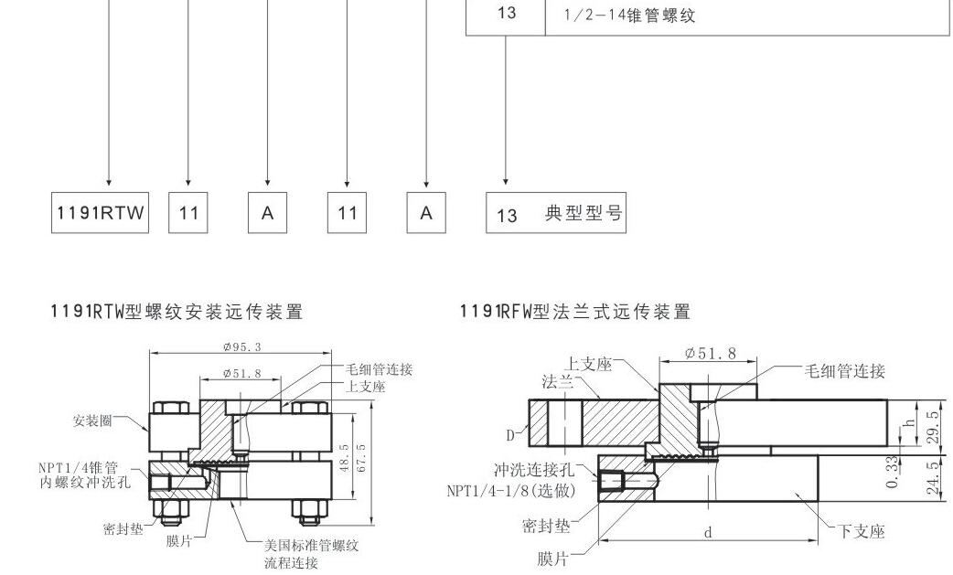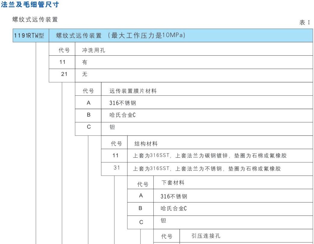 ※被測介質用引壓管引出時易固化或結晶時 ※更換被測介質需要沖洗而不容交混時 ※頭必須保持衛生條件.防止污染時 3351型智能隔膜遠傳差壓(液位)變送器遠傳裝置形式 扁平式遠傳裝置 螺紋安裝式遠傳裝置 法蘭安裝式遠傳裝置 插入筒式遠傳裝置 ※1191SCW卡環式遠傳裝置